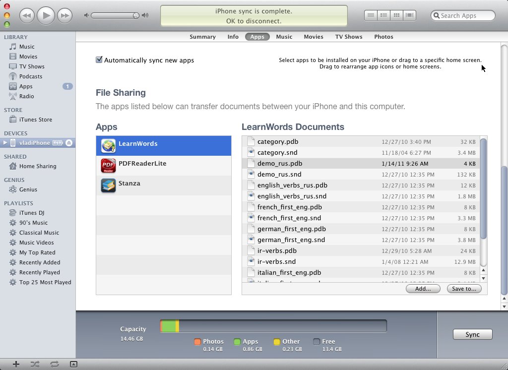 Если вам непонятно где находится указанный раздел в iTunes - нажмите ссылку Синхонизация LearnWords в iTunes (снимок экрана).